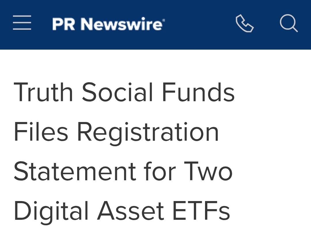트럼프 대통령이 설립한 트럼프 미디어(TMTG) 산하의 '트루스 소셜 펀드(Truth Social Funds)'가 암호화폐 상장지수펀드(ETF) 시장 진출을 본격화했다.