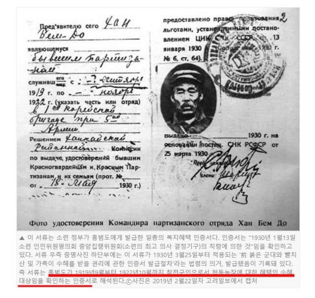 소련 복지혜택 인증서엔 1919-22년간 볼세비키 뻘찌산 복무로 되어 있습니다. 이대로 하면 독립운동조차 빨찌산으로 참가한 것입니다.